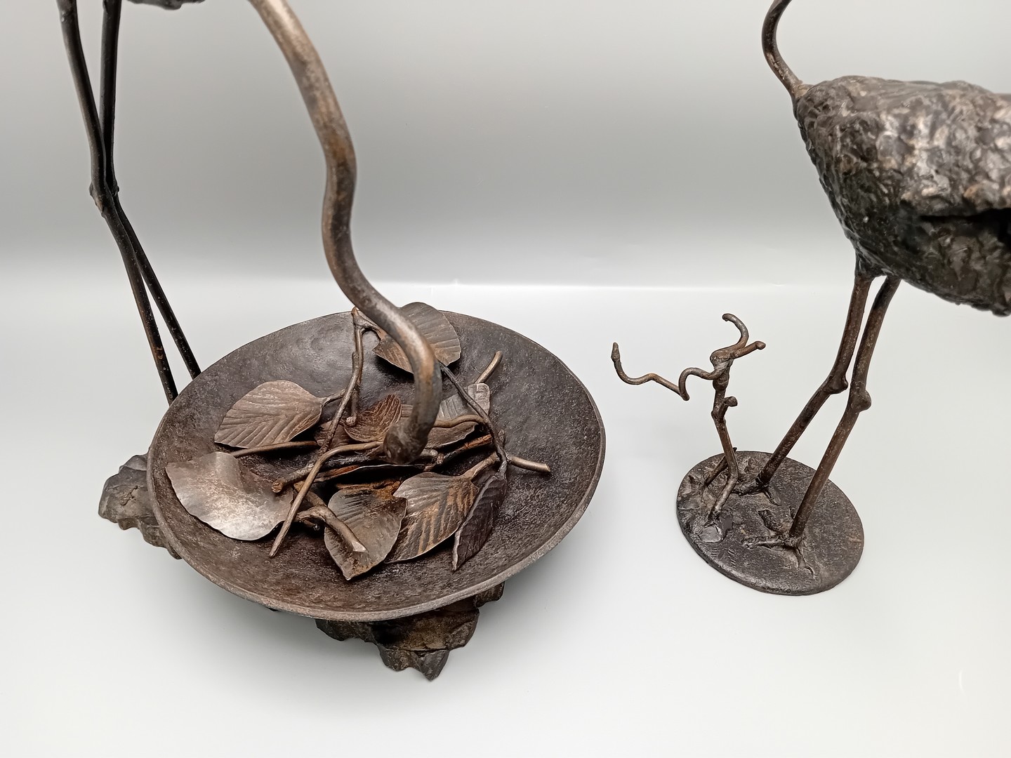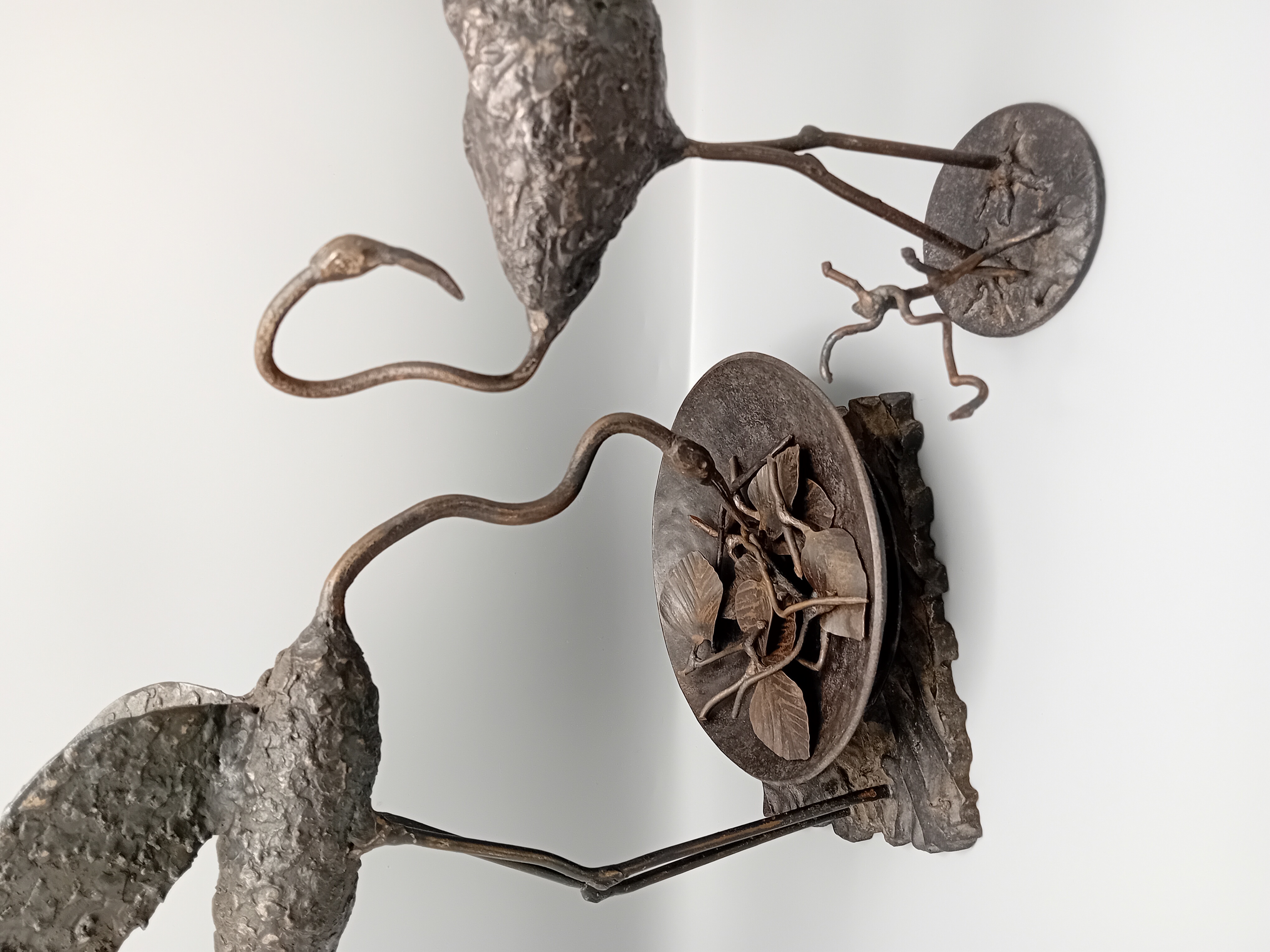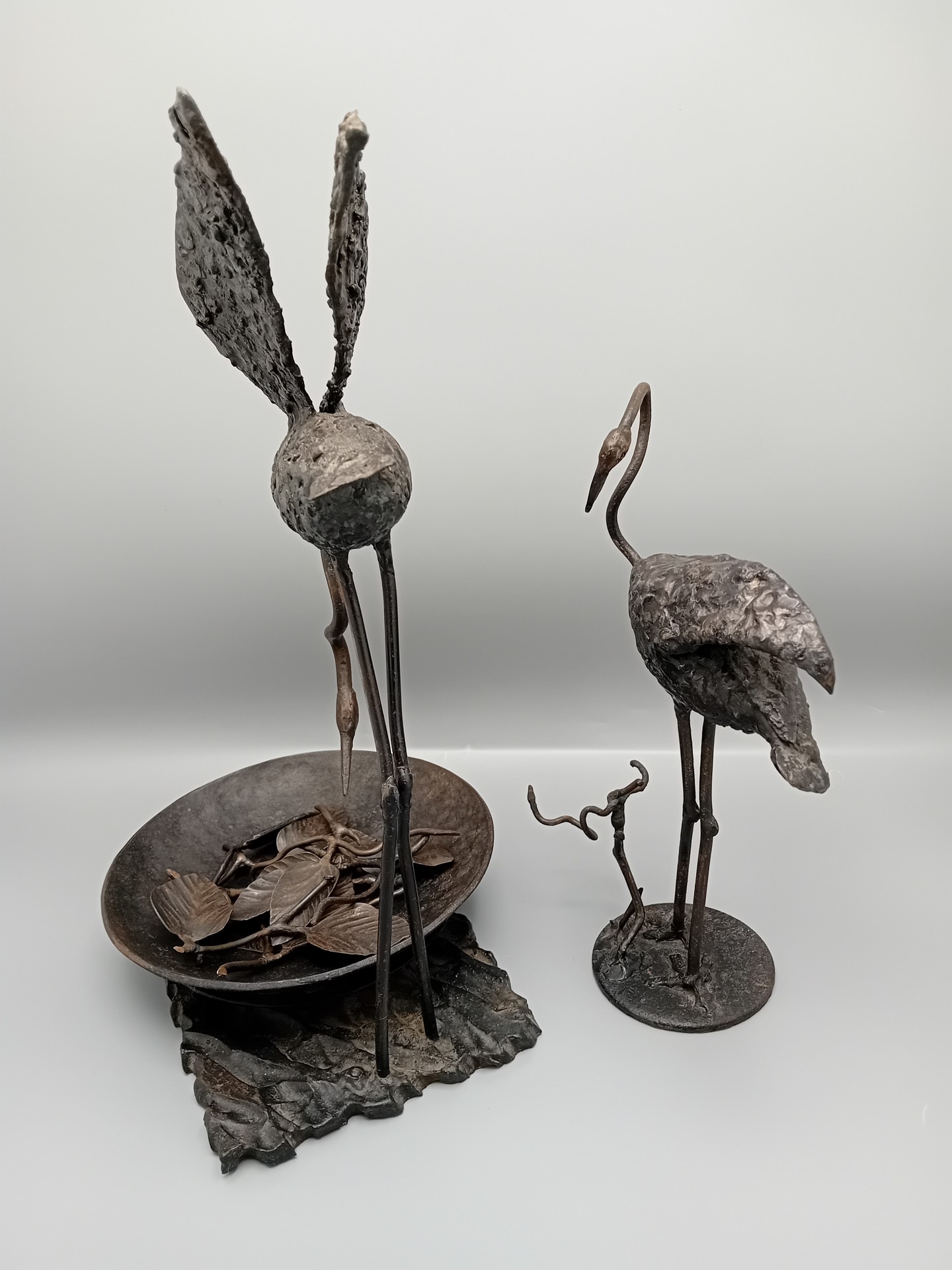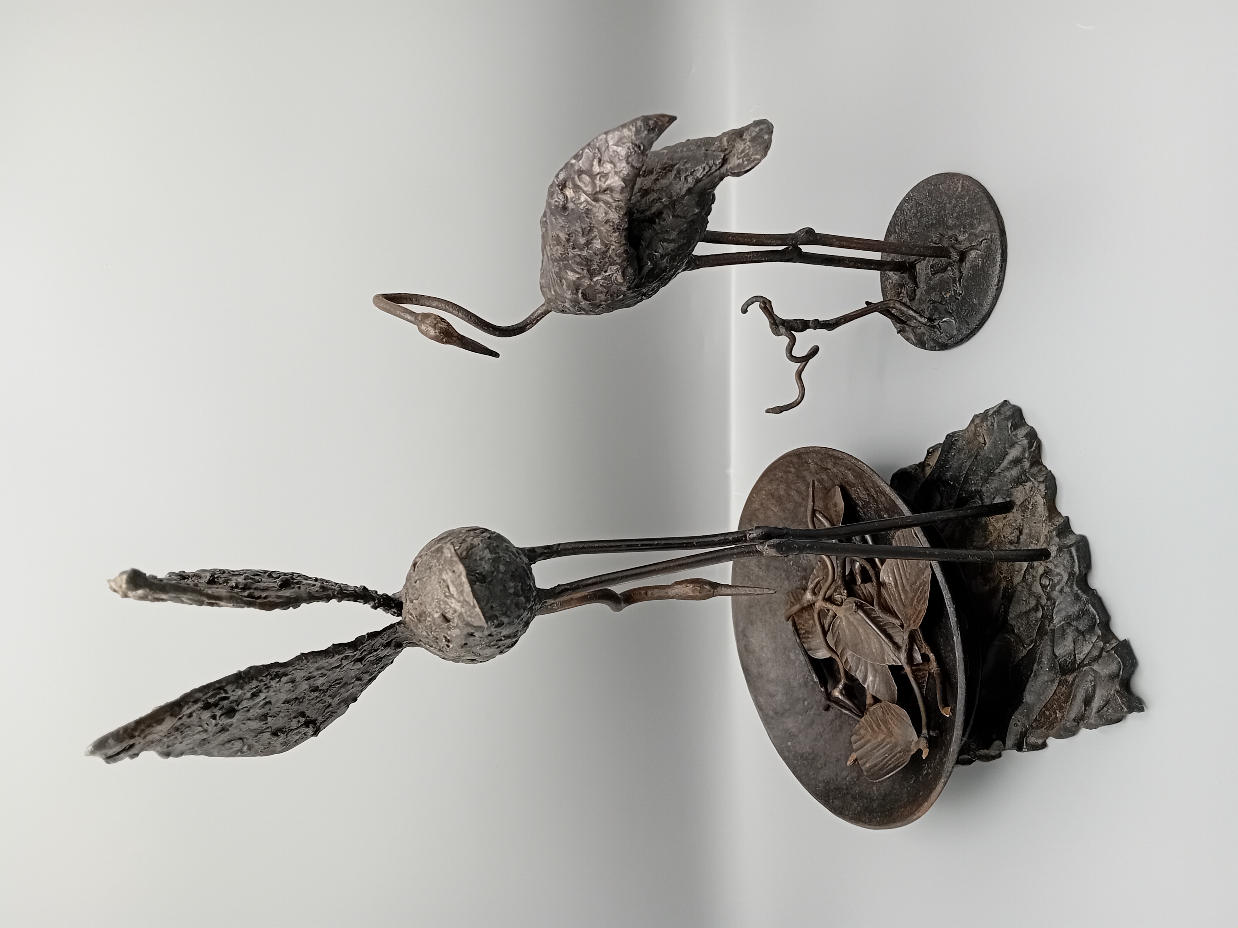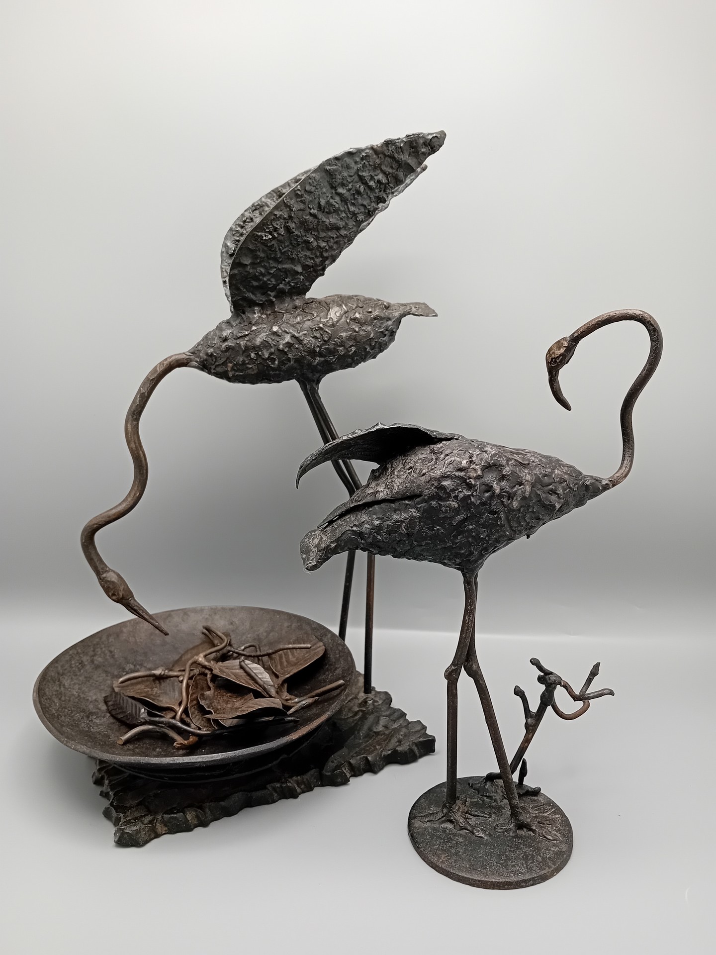 Een elegant smeedijzeren beeldhouwwerk met twee flamingo’s, ontworpen door de Limburgse kunstenaar René Vanderbiezen.