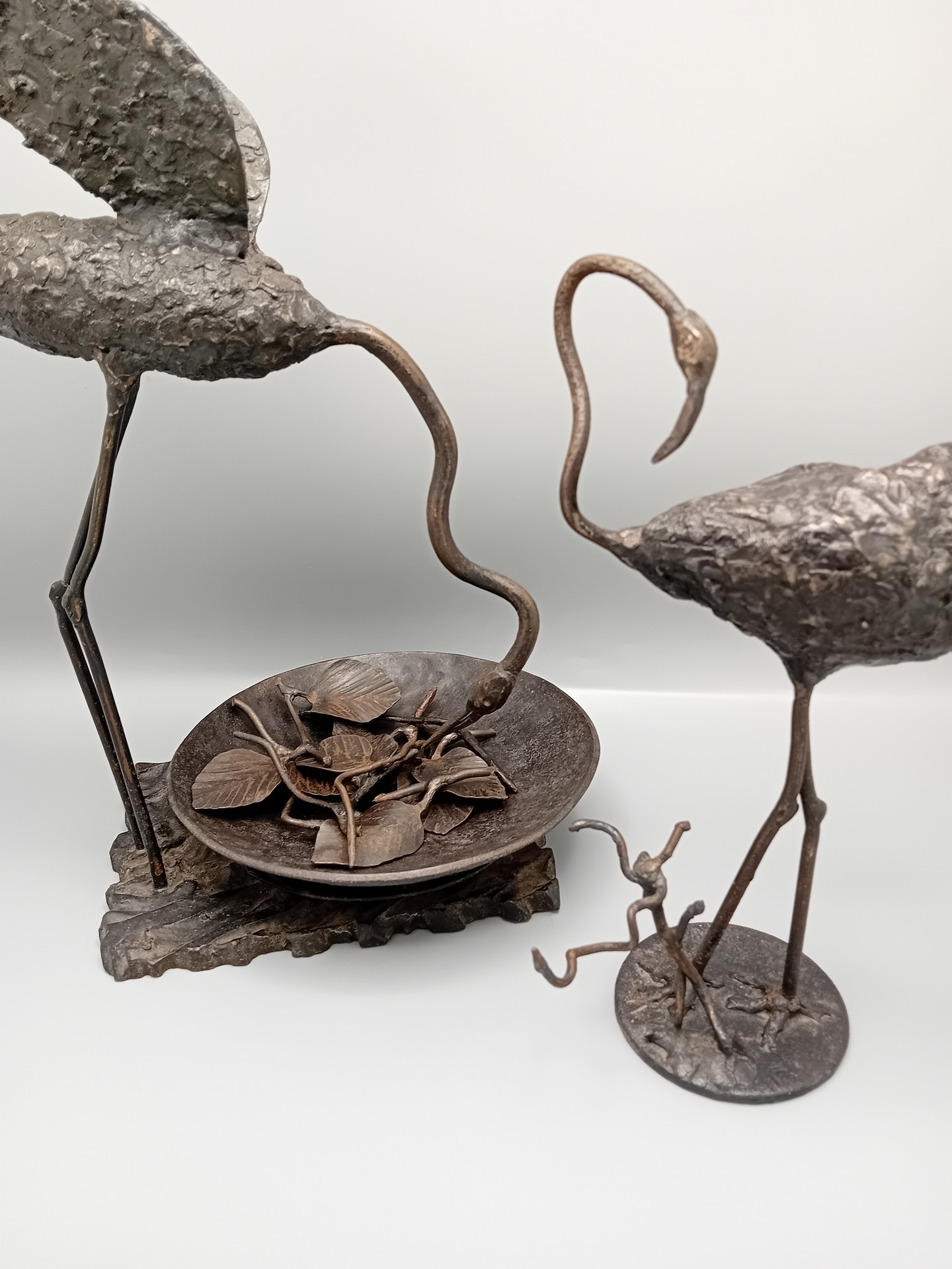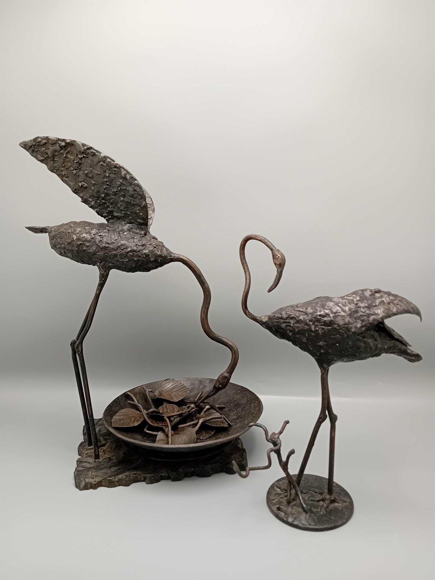 Een elegant smeedijzeren beeldhouwwerk met twee flamingo’s, ontworpen door de Limburgse kunstenaar René Vanderbiezen.